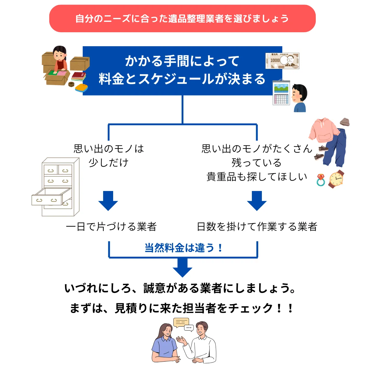 • 遺品整理業者の料金は、人手をどれだけ掛けるかで異なる